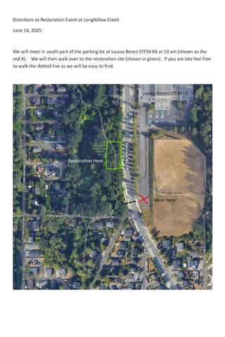 We will meet on the south side of the parking lot for Louisa Boren STEM K8 at 10AM and will walk the short distance to the restoration site across the street after greetings and introductions. Directions to the site are show in the image file.