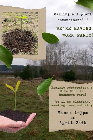 UW environmental science students, in partnership with the Muckleshoot tribe, are working to establish important indigenous prairie plants to the meadow area bordering the beach walk trail north of the Fins art installment. This work party will involve planting, weeding, and mulching.